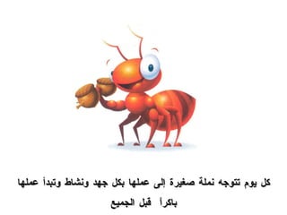 تدور القصة حول نملة صغيرة تعمل بجد وتظهر كفاءة عالية لفتت انتباه الأسد المسؤول، الذي قرر توظيف موظفين آخرين لتحسين الأداء في القسم، مما أدى إلى زيادة التعقيدات و inefficacy. ومع مرور الوقت، أصبح القسم مفعماً بالحزن وفقد روحه، مما جعل الأسد يستعين بخبير لتقليص النفقات وحل المشاكل. في النهاية، تم فصل النملة بسبب تراجع أدائها في ظل النظام الجديد.