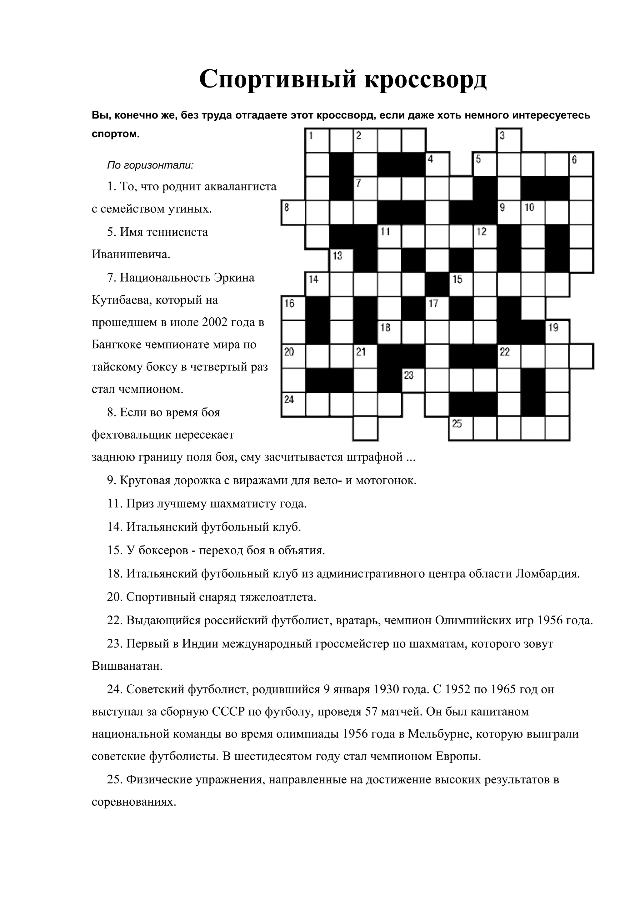 Документ представляет собой спортивный кроссворд, состоящий из вопросов по различным видам спорта, включая футбол, теннис и шахматы. В кроссворде содержатся подсказки как по горизонтали, так и по вертикали, охватывающие исторических спортсменов, соревнования и терминологию. Ответы предполагают знание спорта и некоторых культурных аспектов, связанных с ним.