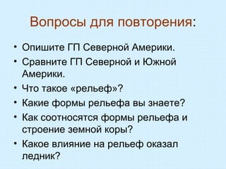 Документ содержит вопросы и задания по рельефу Северной Америки и его взаимосвязи со строением земной коры. Обсуждаются сравнительные аспекты рельефа Северной и Южной Америки, а также полезные ископаемые, разнообразие форм рельефа и влияние ледников. Ученикам предлагается описать одну из форм рельефа, используя учебник, и выполнить домашнее задание.