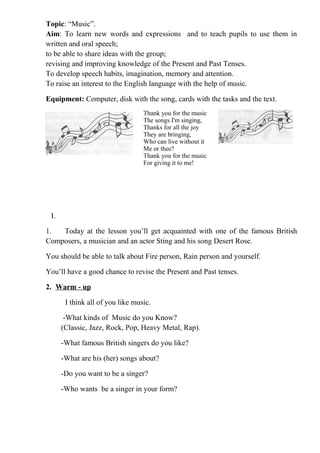 The document provides instructions for an English lesson about the singer Sting and his song "Desert Rose." It includes activities for students to learn vocabulary from the song, discuss associations with deserts, and change a narrative about dreaming in the desert into the lyrics of the song by using the present tense. Students are asked to fill in blanks with the appropriate present tense form while keeping some lines the same. The lesson aims to develop students' English skills through music.