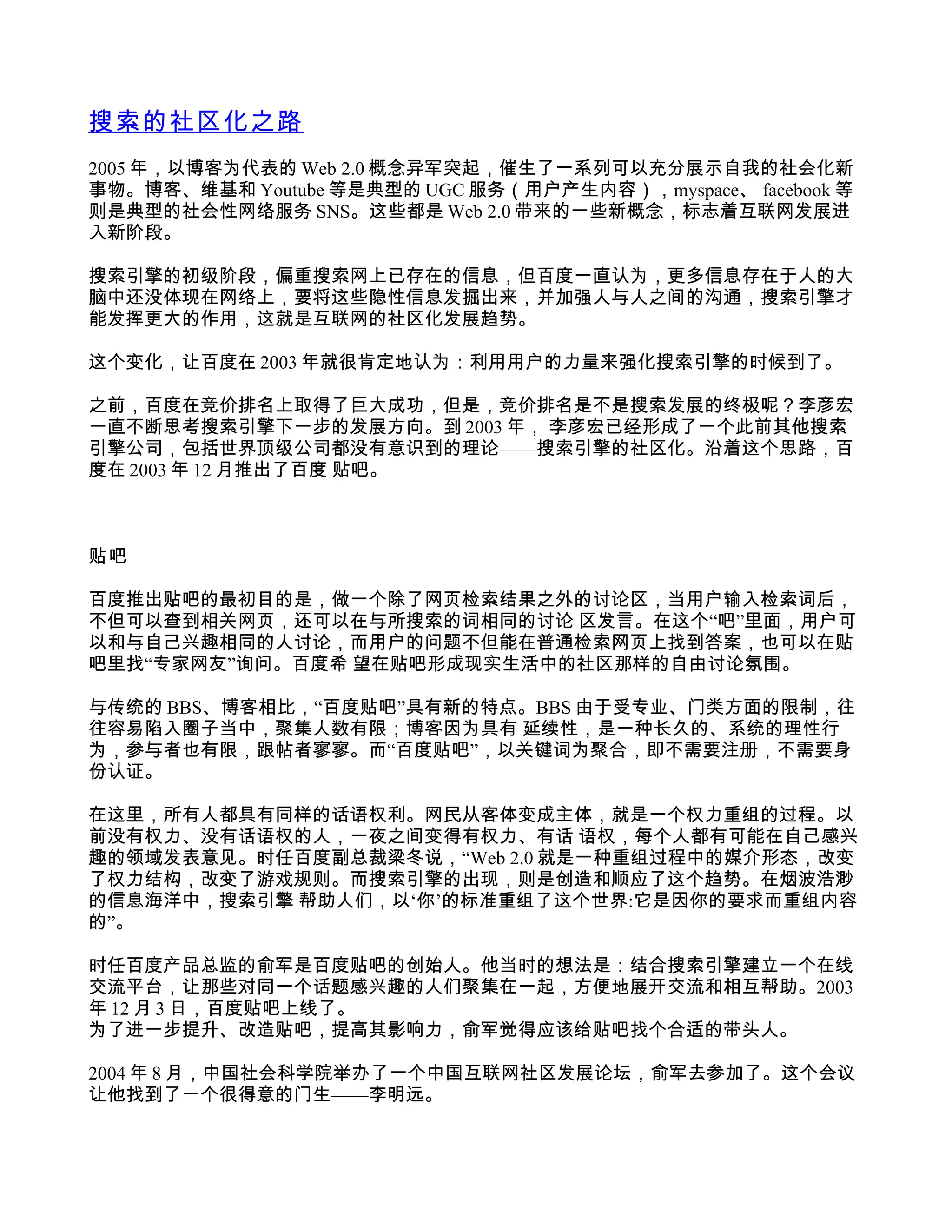 文档探讨了百度在社区化搜索引擎发展的过程,强调了用户生成内容(UGC)和社交网络服务(SNS)的重要性。百度于2003年推出贴吧,旨在利用用户的力量增强搜索引擎功能,促进用户之间的交流与互动。随着社区产品的发展,百度关注用户需求的满足,致力于营造良好的网络社区氛围,推动其整体业务的提升和流量增长。