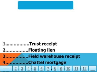 The document discusses different types of inventory-backed loans including trust receipts, floating liens, field warehouse receipts, chattel mortgages, and terminal warehouse receipts. Various terms related to these loan types are listed and formatted with different symbols possibly indicating their relationship to one another.