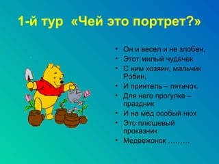 Документ представляет собой описание игры-викторины 'Хоровод сказок', включающей различные туры, такие как 'Чей это портрет?', 'Угадай сказку' и 'Зимние сказки'. Участники должны будут вставить правильные ответы на вопросы о персонажах, сказках и других элементах, связанных с отечественным фольклором. Викторина включает в себя элементы кроссвордов и блиц-конкурсов, что делает её интересной и интерактивной.
