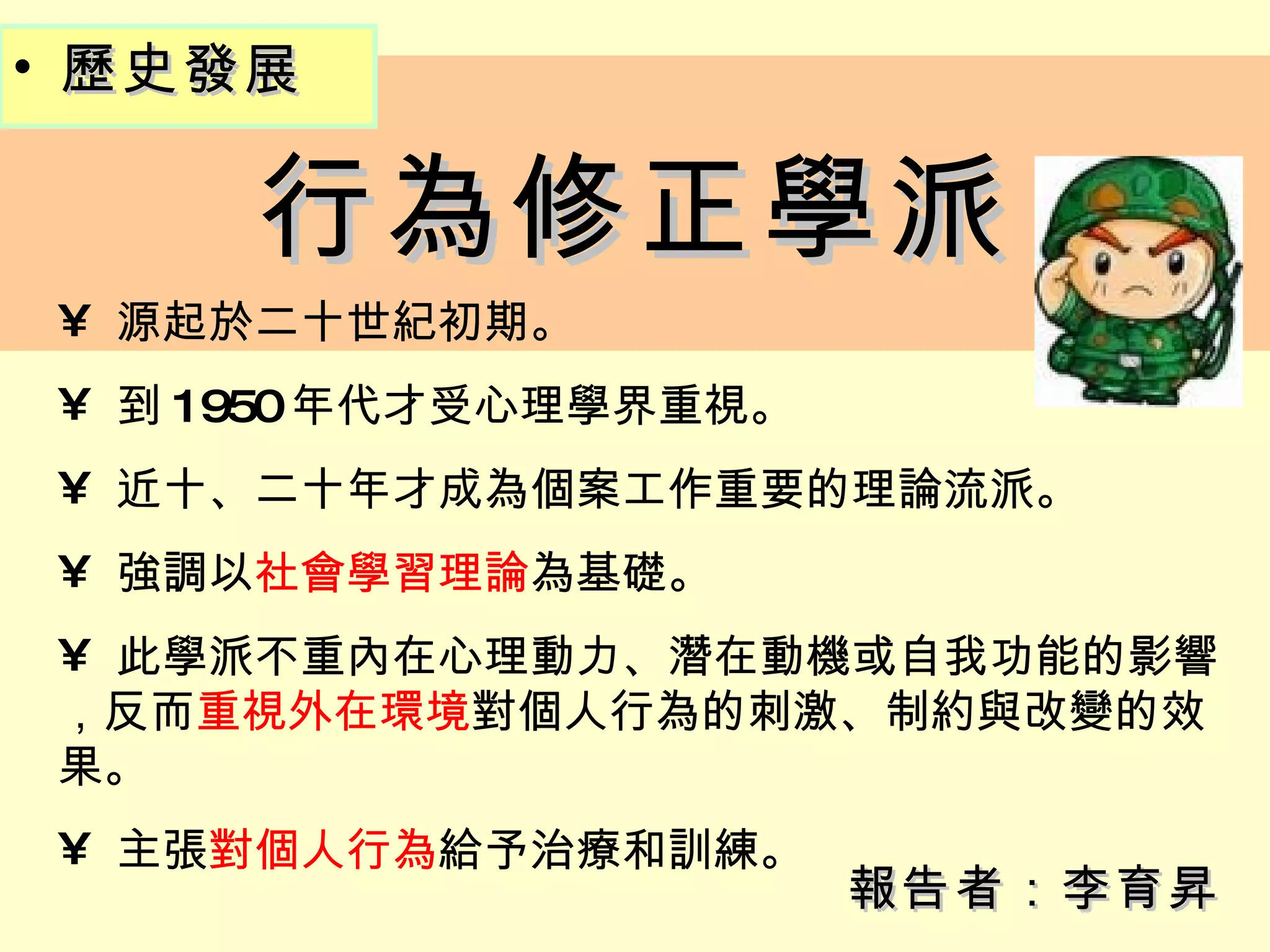 行為修正學派起源於二十世紀初,強調外在環境對行為的影響,並將行為劃分為操作性和反應性兩類。此學派的治療方法主要依賴可觀察的行為,專注於當前行為的改變,而非內在動機。報告中詳細探討了行為修正的技巧和不同導向,包括反應制約、操作制約和社會學習導向。