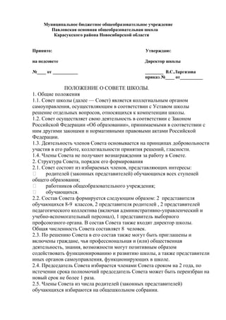 В документе представлено положение о совете школы, который является коллегиальным органом самоуправления, осуществляющим задачи, связанные с развитием и управлением образовательным процессом. Совет состоит из членов, представляющих родителей, работников школы и обучающихся, и осуществляет контроль за реализацией образовательных программ, финансовой деятельностью и условиями образовательного процесса. Он собирается на заседания по мере необходимости, но не реже одного раза в полугодие, и принимает решения большинством голосов.
