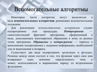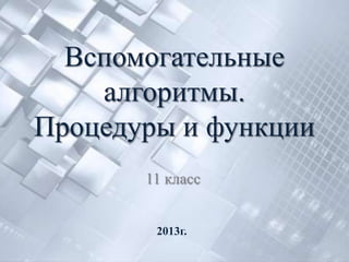 Документ описывает вспомогательные алгоритмы, процедуры и функции в программировании на языке Паскаль для 11 класса. Объясняются основные концепции подпрограмм, их типы и синтаксис, а также приводятся примеры использования процедур и функций. Также содержатся задания для практического применения знаний о подпрограммах.