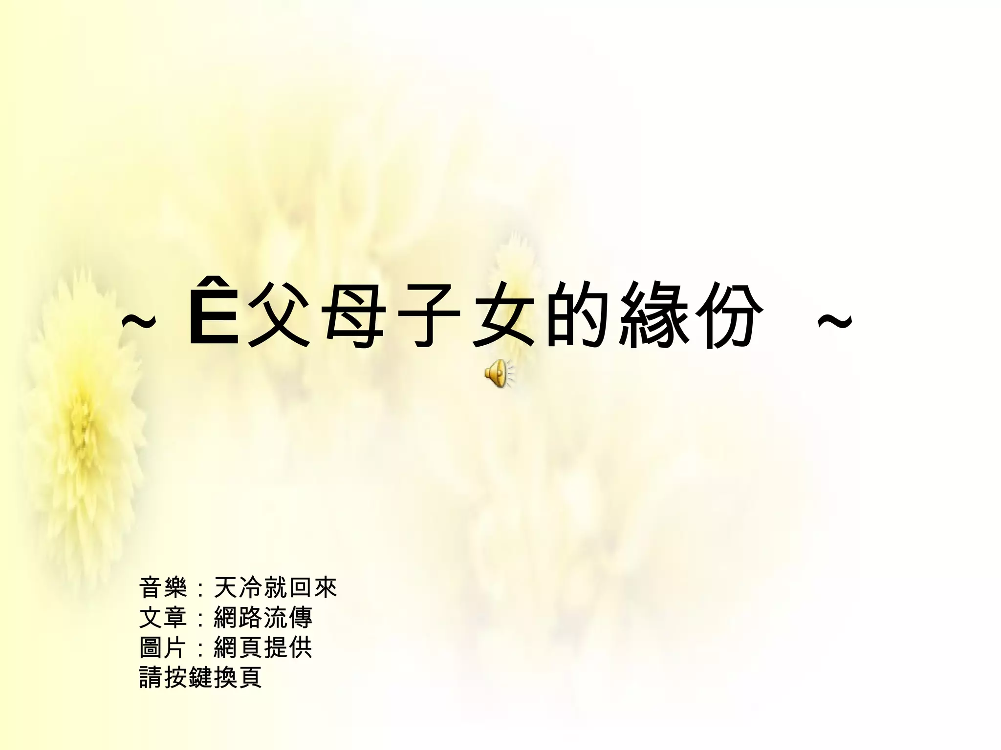 ~ 父母子女的緣份 ~ 音樂:天冷就回來 文章:網路流傳 圖片:網頁提供 請按鍵換頁