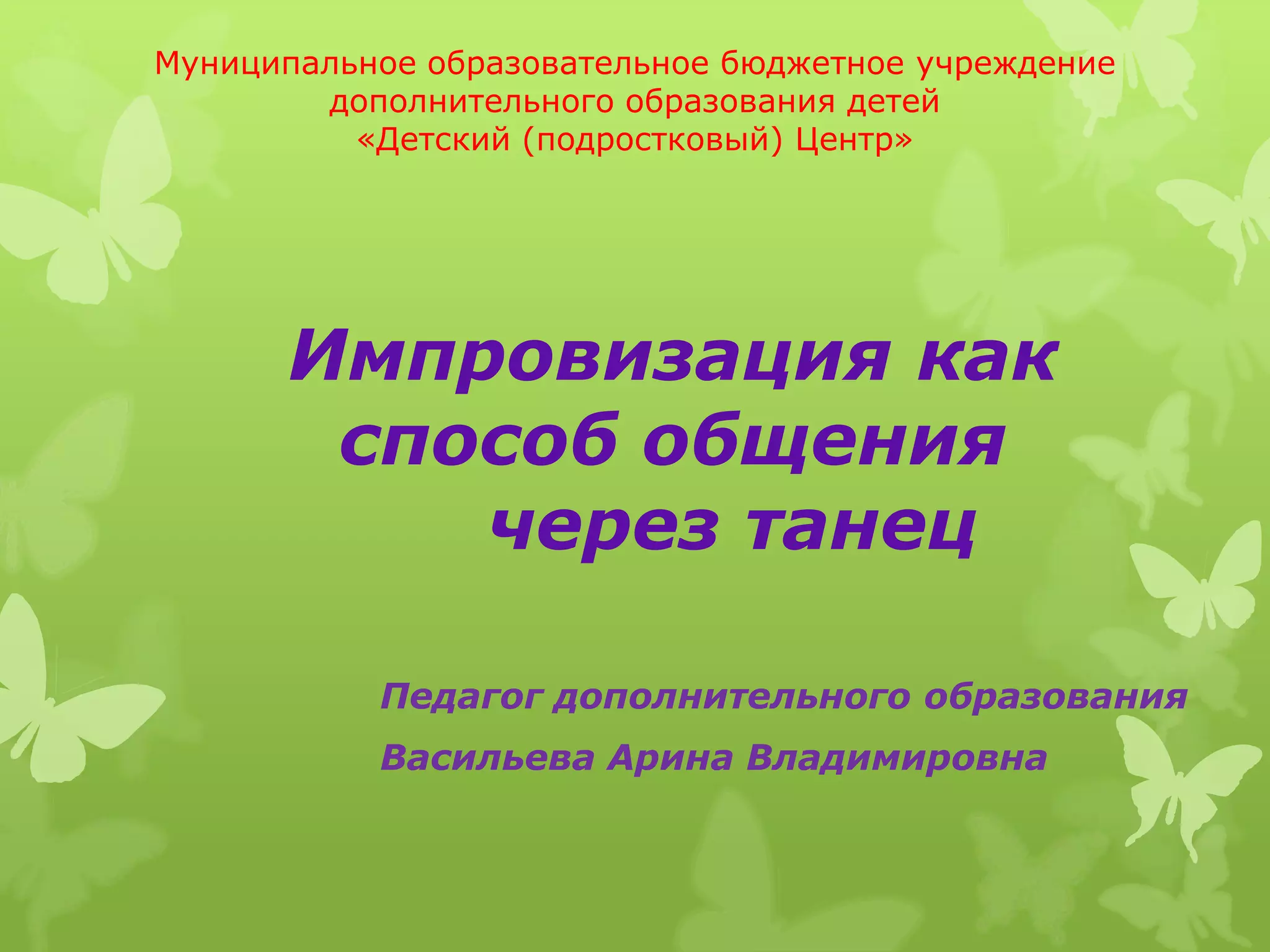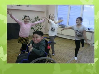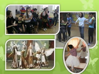 Документ описывает программу танцевальной терапии, предназначенную для детей в возрасте 8-12 лет в инклюзивной группе, с акцентом на использование импровизации как способа общения. Основная цель программы - развивать социальные, эмоциональные и физические навыки участников через движение и творческое самовыражение. Занятия включают организационные и практические части, направленные на развитие спонтанности, креативности и осознание чувств.