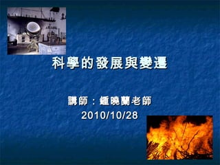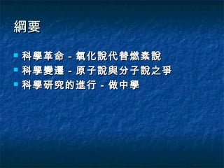 本文件探讨了科学发展史上的几个重要理论,包括燃素说、氧化理论和原子说。拉瓦节颠覆了燃素说,确立了氧在燃烧中的重要性,并提出质量守恒定律。最后,道尔顿和阿佛加德罗的研究进一步推动了原子和分子的理解,形成了现代化学的基础。