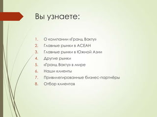 Компания 'гранд вакту' предоставляет услуги по консультированию и поддержке бизнеса в странах Азии, в основном на рынках АСЕАН и Южной Азии. Она работает с тщательно отобранными клиентами, включая малый бизнес и международные корпорации, предлагя широкий спектр услуг от создания компаний до управления проектами. Основные сферы деятельности включают фармацевтику, строительство, технологические решения и инвестиции в развивающиеся рынки.