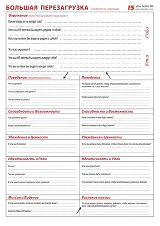 Этот документ я часто использую в начале работы с клиентами, которые хотят разобраться со своими целями и насколько они экологичны; действительно ли их цели - их цели (а не цели мамы). Также его можно использовать для работы с личным брендом, чтобы перезагрузить свои текущие цели, вернуть смысл жизни. Из комментариев в документе не уверен, что все будет ясно, что и как делать. При заполнении обычно появляется много вопросов о правильном заполнении, что означают похожие слова и вопросы. Если такое будет и у Вас - обращайтесь. На данный момент лучше связываться через мою страницу в фейсбуке - http://www.facebook.com/i.solodov Успехов!
