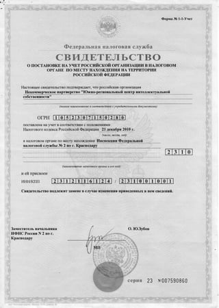 This document certifies that a Russian organization called the "Non-Commercial Partnership 'Center for Intellectual Property'" owns property according to Russian law. The certification was issued by the tax authority in Krasnodar, Russia on December 21, 2010. The document number and seals are provided for verification purposes.