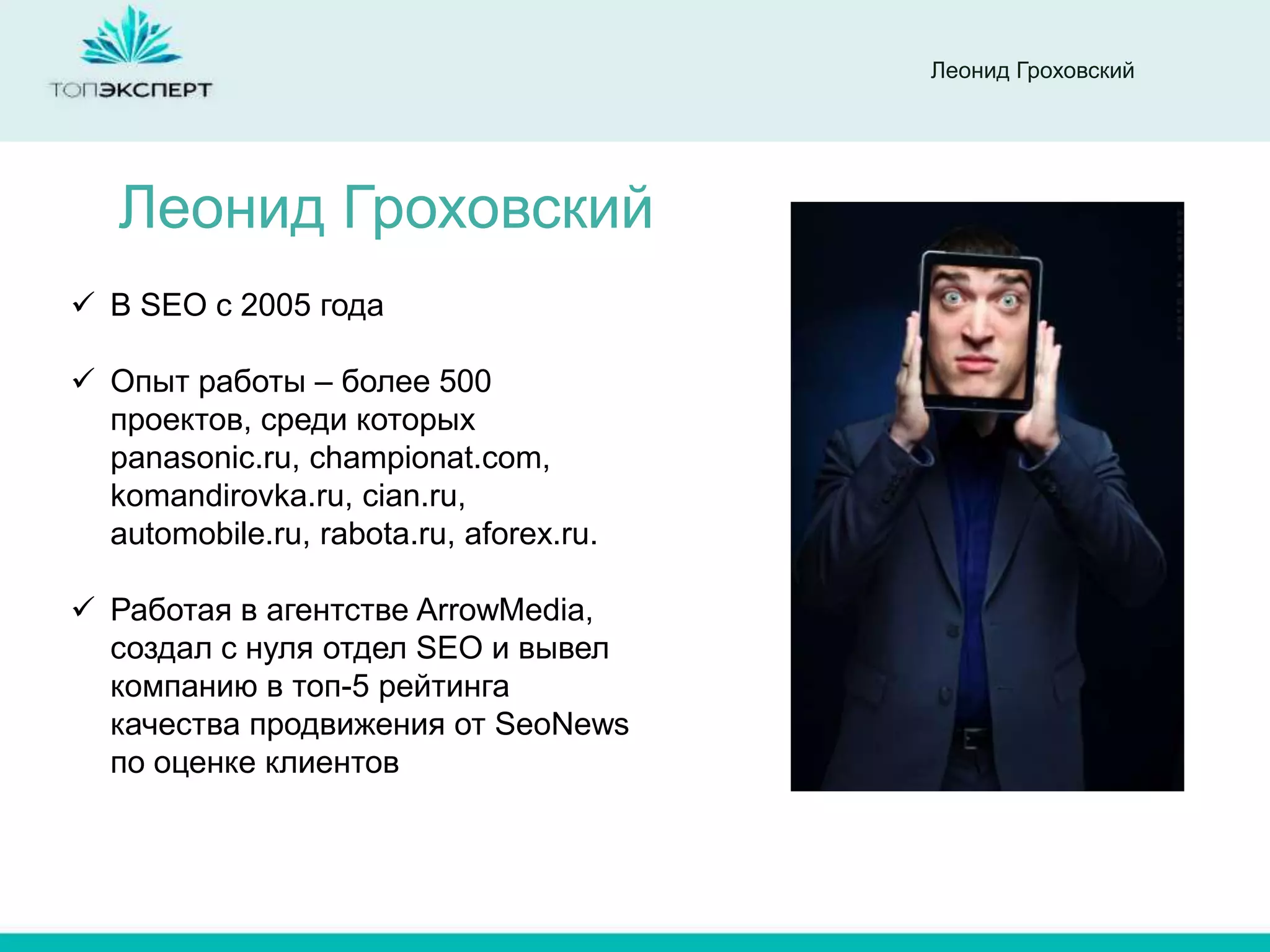 Документ представляет собой информацию о вебинаре по SEO, проводимом Леонидом Гроховским, экспертом с большим опытом в этой области. Цели вебинара включают предоставление актуальной информации о рынке SEO, обучение избегать ошибок и рекомендации по эффективному продвижению сайтов. Также обсуждаются важные аспекты работы SEO-агентств и стратегии продвижения.