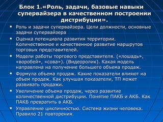 Документ описывает тренинг «школа супервайзинга», направленный на повышение эффективности работы супервайзеров в дистрибуции за три дня. Тренинг состоит из трех блоков, охватывающих роли и задачи супервайзера, постановку эффективных задач и стили управления персоналом. Участники получают сертификат по окончании курса и ознакомлены с различными методами ведения работы с торговыми представителями.