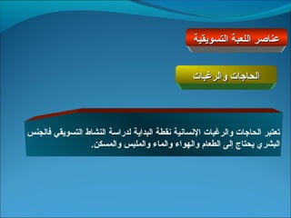 يتناول الوثيقة عناصر اللعبة التسويقية مثل الحاجات والرغبات، المنتجات، والتبادل، بالإضافة إلى السوق والمفهوم الحديث للتسويق. تركز على أهمية المستهلك وتفصيل مكونات العملية التسويقية، التي تشمل المزيج التسويقي (المنتج، السعر، التوزيع، والترويج) وخطوات عملية البيع. كما تتطرق إلى أهمية البحث والتخطيط لإعداد حملات تسويقية فعالة تلبية لاحتياجات ورغبات المستهلكين.