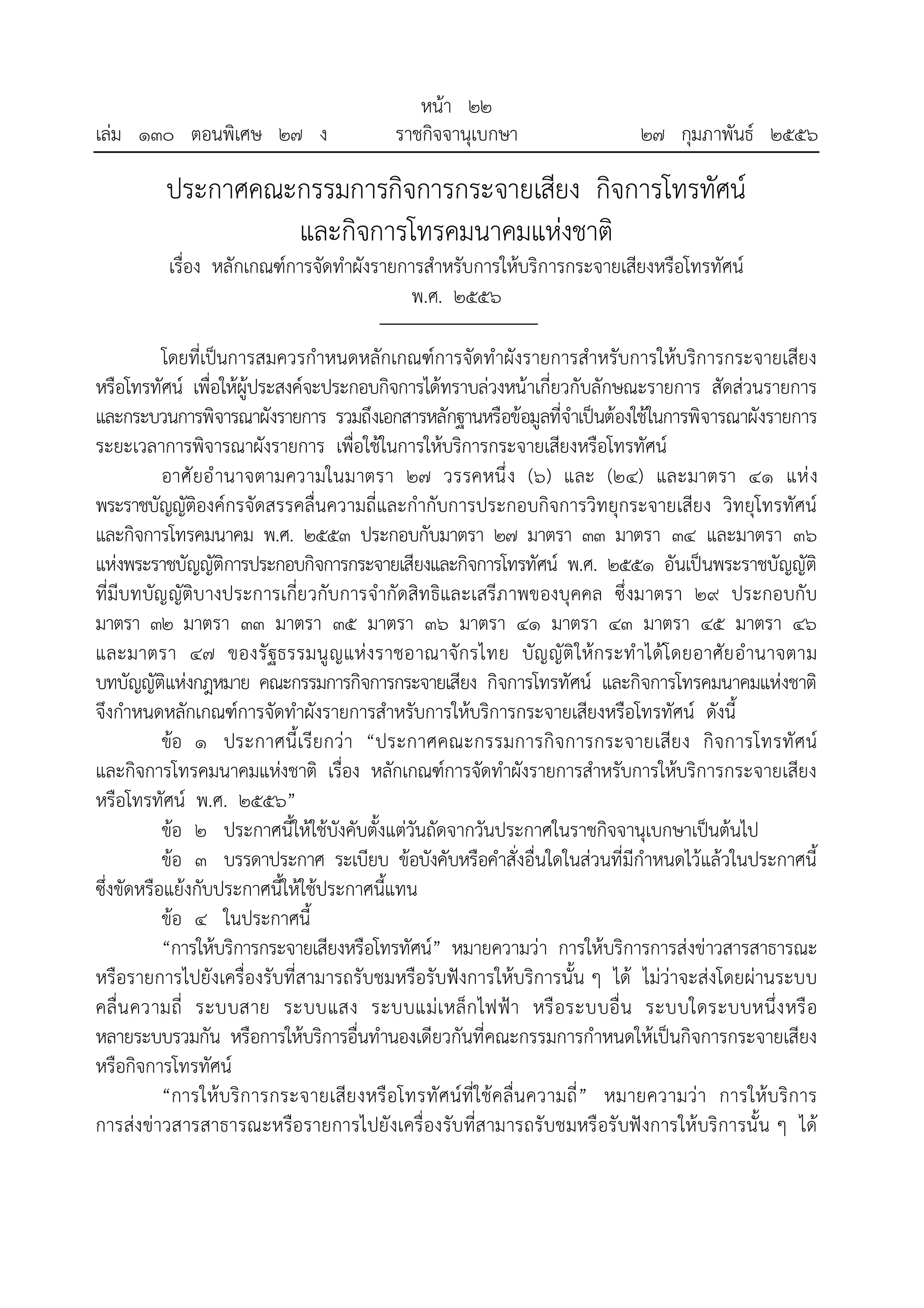 ตอนพิเศษ ๒๗ ง ราชกิจจานุเบกษา ๒๗ กุมภาพันธ์ ๒๕๕๖ ประกาศคณะกรรมการกิจการกระจายเสียง กิจการโทรทัศน์ และกิจการโทรคมนาคมแห่งชาติ เรื่อง หลักเกณฑ์การจัดทําผังรายการสําหรับการให้บริการกระจายเสียงหรือโทรทัศน์ พ.ศ. ๒๕๕๖ โดยที่เป็นการสมควรกําหนดหลักเกณฑ์การจัดทําผังรายการสําหรับการให้บริการกระจายเสียง หรือโทรทัศน์ เพื่อให้ผู้ประสงค์จะประกอบกิจการได้ทราบล่วงหน้าเกี่ยวกับลักษณะรายการ สัดส่วนรายการ และกระบวนการพิจารณาผังรายการ รวมถึงเอกสารหลักฐานหรือข้อมูลที่จําเป็นต้องใช้ในการพิจารณาผังรายการ ระยะเวลาการพิจารณาผังรายการ เพื่อใช้ในการให้บริการกระจายเสียงหรือโทรทัศน์ อาศัยอํานาจตามความในมาตรา ๒๗ วรรคหนึ่ง (๖) และ (๒๔) และมาตรา ๔๑ แห่ง พระราชบัญญัติองค์กรจัดสรรคลื่นความถี่และกํากับการประกอบกิจการวิทยุกระจายเสียง วิทยุโทรทัศน์ และกิจการโทรคมนาคม พ.ศ. ๒๕๕๓ ประกอบกับมาตรา ๒๗ มาตรา ๓๓ มาตรา ๓๔ และมาตรา ๓๖ แห่งพระราชบัญญัติการประกอบกิจการกระจายเสียงและกิจการโทรทัศน์ พ.ศ. ๒๕๕๑ อันเป็นพระราชบัญญัติ ที่มีบทบัญญัติบางประการเกี่ยวกับการจํากัดสิทธิและเสรีภาพของบุคคล ซึ่งมาตรา ๒๙ ประกอบกับ มาตรา ๓๒ มาตรา ๓๓ มาตรา ๓๕ มาตรา ๓๖ มาตรา ๔๑ มาตรา ๔๓ มาตรา ๔๕ มาตรา ๔๖ และมาตรา ๔๗ ของรัฐธรรมนูญแห่งราชอาณาจักรไทย บัญญัติให้กระทําได้โดยอาศัยอํานาจตาม บทบัญญัติแห่งกฎหมาย คณะกรรมการกิจการกระจายเสียง กิจการโทรทัศน์ และกิจการโทรคมนาคมแห่งชาติ จึงกําหนดหลักเกณฑ์การจัดทําผังรายการสําหรับการให้บริการกระจายเสียงหรือโทรทัศน์ ดังนี้ ข้อ ๑ ประกาศนี้เรียกว่า “ประกาศคณะกรรมการกิจการกระจายเสียง กิจการโทรทัศน์ และกิจการโทรคมนาคมแห่งชาติ เรื่อง หลักเกณฑ์การจัดทําผังรายการสําหรับการให้บริการกระจายเสียง หรือโทรทัศน์ พ.ศ. ๒๕๕๖” ข้อ ๒ ประกาศนี้ให้ใช้บังคับตั้งแต่วันถัดจากวันประกาศในราชกิจจานุเบกษาเป็นต้นไป ข้อ ๓ บรรดาประกาศ ระเบียบ ข้อบังคับหรือคําสั่งอื่นใดในส่วนที่มีกําหนดไว้แล้วในประกาศนี้ ซึ่งขัดหรือแย้งกับประกาศนี้ให้ใช้ประกาศนี้แทน ข้อ ๔ ในประกาศนี้ “การให้บริการกระจายเสียงหรือโทรทัศน์” หมายความว่า การให้บริการการส่งข่าวสารสาธารณะ หรือรายการไปยังเครื่องรับที่สามารถรับชมหรือรับฟังการให้บริการนั้น ๆ ได้ ไม่ว่าจะส่งโดยผ่านระบบ คลื่นความถี่ ระบบสาย ระบบแสง ระบบแม่เหล็กไฟฟ้า หรือระบบอื่น ระบบใดระบบหนึ่งหรือ หลายระบบรวมกัน หรือการให้บริการอื่นทํานองเดียวกันที่คณะกรรมการกําหนดให้เป็นกิจการกระจายเสียง หรือก