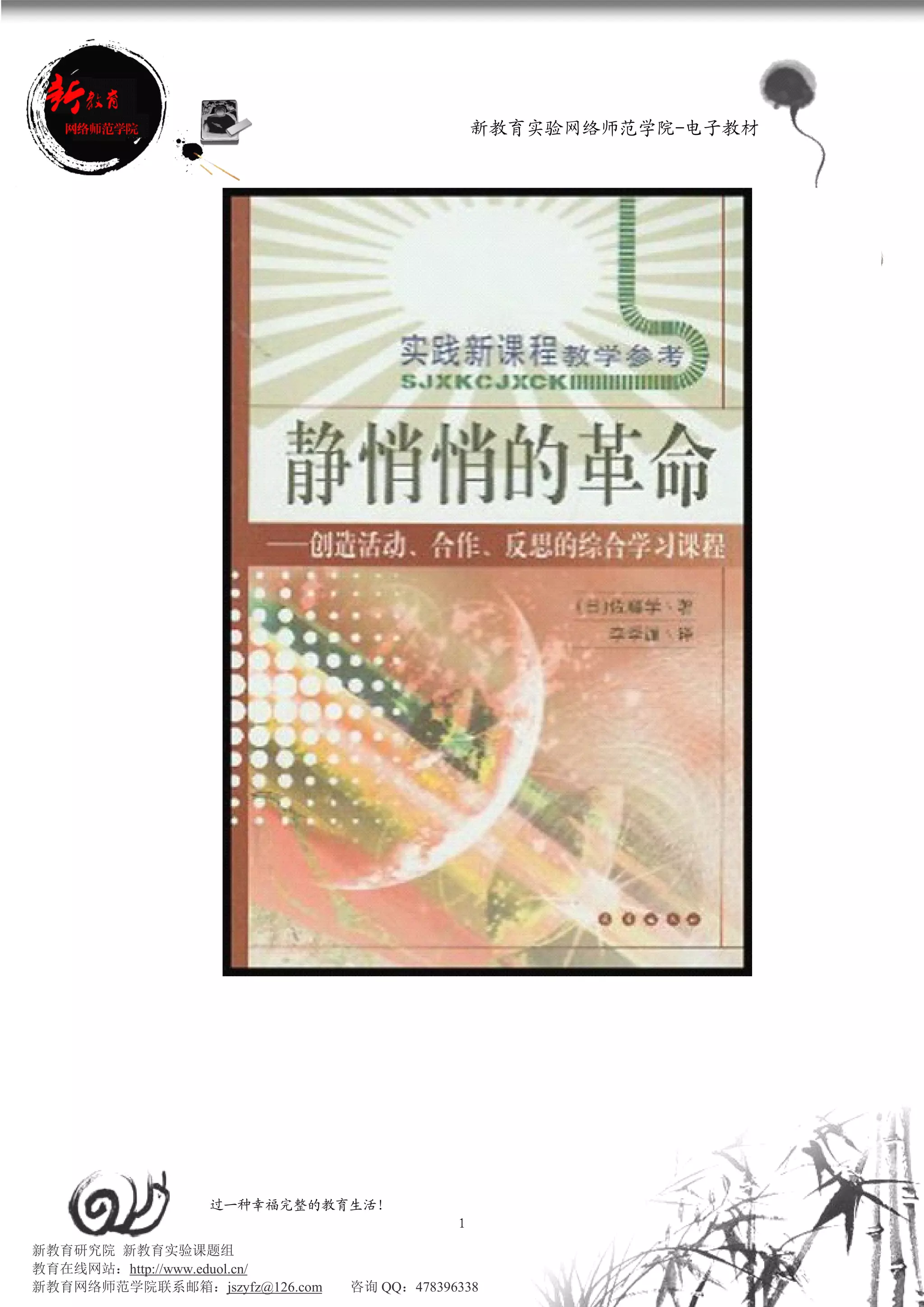 本文件介绍了新教育实验网络师范学院的电子教材《静悄悄的革命》,讨论现代教育改革的理念与实践,强调在教学中促进教师与学生之间的合作与互动,以提升教育质量。内容包括对教育形式主义的批判,以及建立学习共同体的必要性,为教师的专业发展提供建议和指导。文件还提到了此书作为教师专业发展项目的基本书籍,呼吁教师共同参与教育改革。