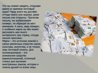 Документ описывает историю появления почтовых марок, начиная с первой марки, выпущенной в Великобритании в 1840 году, и ее влияния на другие страны. Также упоминаются творения наполеона орды, который запечатлел архитектурные памятники Беларуси и значимые события, связанные с ними. В завершение, материал подчеркивает важность марок как исторического источника информации о Беларуси.