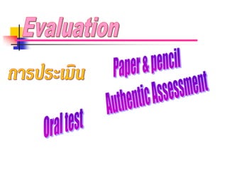 ประเภทการแกปญหา เพือใหผูเรียนรูจักคิด การตัดสินใจโดยกําหนดเกณฑไว ใหผเู รียนพิจารณาตาม ่ เกณฑ ประเภทการทดสอบ ไมมีวัตถุเพื่อการสอน แตใชประเมินการสอนของครูหรือการเรียนของผูเรียน คอมพิวเตอรจะประเมินผลทันทีวาผูเรียนสอบไดลําดับที่เทาไร
