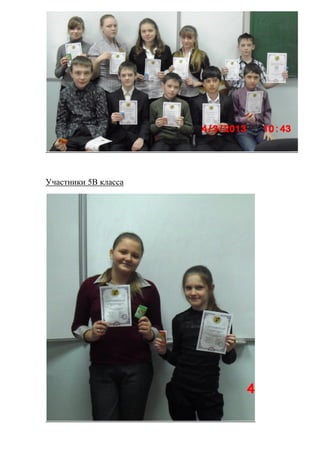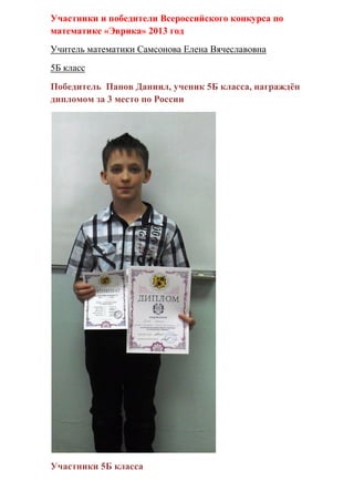 В документе представлены участники и победители всероссийского конкурса по математике «Эврика» 2013 года. Ученик 5б класса Данил Панов занял 3 место, а ученица 2б класса Анастасия Островская - 2 место. Указаны также участники из других классов.