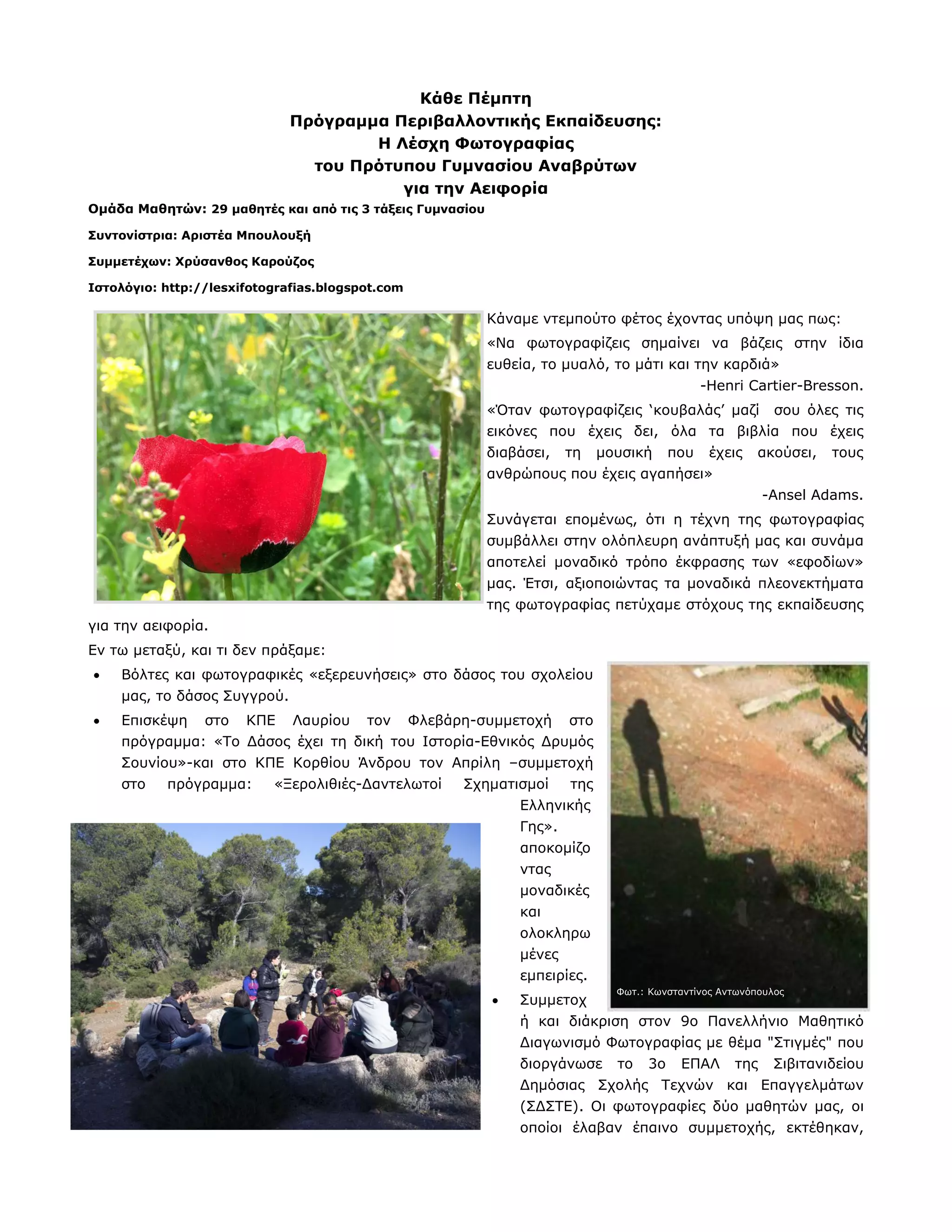 Πρόγραμμα Περιβαλλοντικής Εκπαίδευσης του Π.Γ.Α., σχολικό έτος 2017-18, με τίτλο : Η λέσχη φωτογραφίας του Προτύπου Γυμνασίου Αναβρύτων για την αειφορία