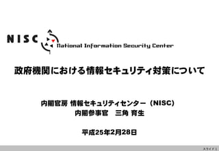 本講演では、我国の情報セキュリティ戦略、サイバー攻撃の最近の傾向、昨今のサイバー攻撃事案の事例の紹介、NISCが推進する政府機関、地方公共団体や、その他重要インフラにおけるセキュリティ対策の詳細についてご説明します。 内閣官房情報セキュリティセンター 内閣参事官 三角 育生(みすみ いくお)氏