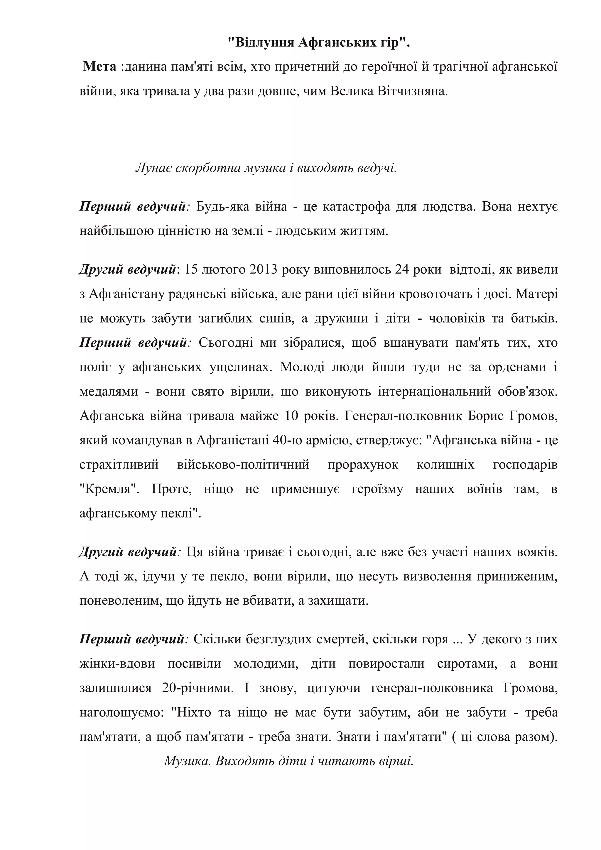 Мета:данина пам'яті всім, хто причетний до героїчної й трагічної афганської