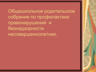 Документ посвящен общешкольному родительскому собранию по профилактике правонарушений среди несовершеннолетних, рассматривающему факторы, способствующие развитию правонарушений и методы их профилактики с акцентом на важность воспитания в семье. Обсуждаются роли родителей и педагогов в формировании правовой культуры и ответственности у молодежи, а также правовые аспекты, касающиеся прав ребенка. Участники подчеркивают необходимость создания в семьях атмосферы любви и доверия для успешного развития детей.