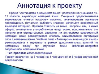 Проект о 'англицизмах в немецком языке', разработанный учителем О. К. Осокиной для учащихся 10-11 классов, направлен на исследование употребления англицизмов и их влияния на современный немецкий язык. В рамках проекта учащиеся будут анализировать причины и сферы, где англицизмы наиболее распространены, а также изучать способы заимствования английских слов в немецком. Проект включает вводные лекции, групповые исследования и защиту результатов в виде презентаций.