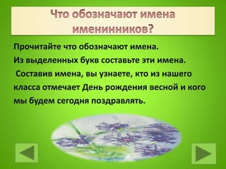 Документ посвящен поздравлению одноклассников с весенними днями рождения, в частности, описывает популярные имена и их значения. В нем также представлены конкурсы и мероприятия для детей, включая создание буквальных букетов и отгадывание загадок о весне. В конце документа представлены пожелания счастья, здоровья и успеха для именинников.