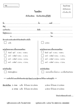 ติดรู ปถ่ายชุด ……….. นักเรี ยนขนาด ใบสมัคร 1 นิ้ว หรื อ 2 นิ้ว เข้ าเรียนพิเศษ ห้ องเรียนพิเศษ f (e) ชื่อ……………………………………………………………….. ชั้น ………………. เลขที่ …………….. ทีอยู่ ………………………………………………………………………………………………………………………………… ่ เบอร์ โทรบ้ าน …………………………………………………. มือถือ …………………………………………………………… ชื่ อผู้ปกครอง 1) …………………………………………………………………………..โทร ……………………………………. 2) …………………………………………………………………………..โทร ……………………………………. มีความประสงค์ จะสมัครเข้ าเรียนพิเศษในระดับชั้น ม.ต้น ม.ปลาย คอร์ สเรียนธรรมดา (เนือหาตามบทเรียน) ้ คอร์ สเรียนธรรมดา (เนือหาตามบทเรียน) ้ จันทร์ – ศุกร์ 17.30 น. – 19.00 น. จันทร์ – ศุกร์ 17.30 น. – 19.00 น. เสาร์ - อาทิตย์ 9.30 น. – 11.30 น. เสาร์ - อาทิตย์ 9.30 น. – 11.30 น. , เสาร์ - อาทิตย์ 12.30 น. – 14.30 น. เสาร์ - อาทิตย์ 12.30 น. – 14.30 น. เสาร์ - อาทิตย์ 15.30 น. – 17.30 น. เสาร์ - อาทิตย์ 15.30 น. – 17.30 น. คอร์ สเรียนเดี่ยว คอร์ สเรียนพิเศษ (ติดต่อครู ผสอน) ู้ ทบทวนเนื้ อหา ตั้งแต่ ม.4 – ม.6 เพื่อเตรี ยมตัวสอบ *** หากห้ องไม่ ว่างและมีนักเรี ยนแต่ ละกลุ่ม น้ อยกว่า 6 คน ผู้สอนจะให้ เรี ยนรวมกับกลุ่มอืน *** ่ อัตราค่ าเรียน 3 - 5 คน ม.ต้น ชัวโมงละ 50 บ.ต่อคน ่ ม.ปลาย ชัวโมงละ 55 บ.ต่อคน ่ 6 - 15 คน ม.ต้น ชัวโมงละ 40 บ.ต่อคน ่ ม.ปลาย ชัวโมงละ 45 บ.ต่อคน ่ โปรดอ่ านข้ อตกลงด้ านหลัง ….. ครู ฝ้าย สอนเฉพาะ ม.ต้ น โทร.0845712502 ครู เอ็ดสอน ม.ต้ น + ม.ปลาย โทร. 0800313141 , 0840408082
