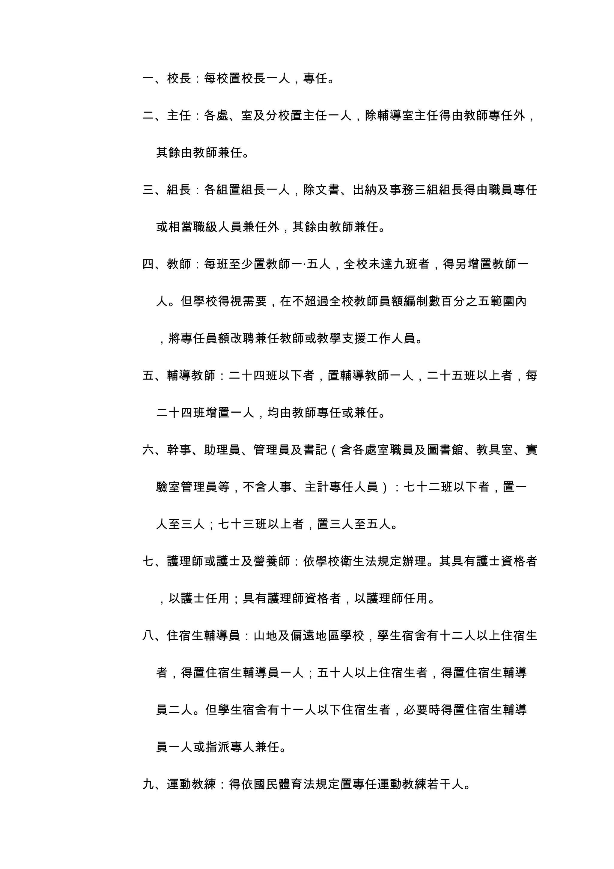 本文件规定了国民小学与国民中学的班级和教职员工编制标准,包括各年级每班的学生人数及教师的配比。尤其在山地、偏远及离岛学校可根据实际情况适当降低班级人数。文件还规定了校长、主任、教师及其他辅助人员的任用标准以及对于不同规模学校的相关灵活性。