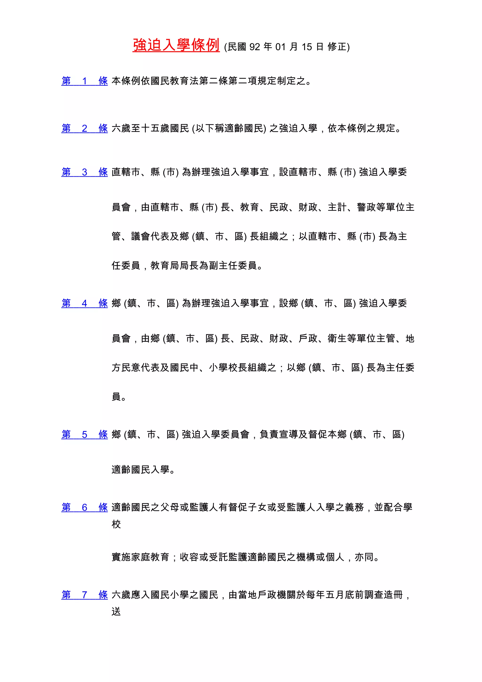 年 01 月 15 日 修正) 第 1 條 本條例依國民教育法第二條第二項規定制定之。 第 2 條 六歲至十五歲國民 (以下稱適齡國民) 之強迫入學,依本條例之規定。 第 3 條 直轄市、縣 (市) 為辦理強迫入學事宜,設直轄市、縣 (市) 強迫入學委 員會,由直轄市、縣 (市) 長、教育、民政、財政、主計、警政等單位主 管、議會代表及鄉 (鎮、市、區) 長組織之;以直轄市、縣 (市) 長為主 任委員,教育局局長為副主任委員。 第 4 條 鄉 (鎮、市、區) 為辦理強迫入學事宜,設鄉 (鎮、市、區) 強迫入學委 員會,由鄉 (鎮、市、區) 長、民政、財政、戶政、衛生等單位主管、地 方民意代表及國民中、小學校長組織之;以鄉 (鎮、市、區) 長為主任委 員。 第 5 條 鄉 (鎮、市、區) 強迫入學委員會,負責宣導及督促本鄉 (鎮、市、區) 適齡國民入學。 第 6 條 適齡國民之父母或監護人有督促子女或受監護人入學之義務,並配合學 校 實施家庭教育;收容或受託監護適齡國民之機構或個人,亦同。 第 7 條 六歲應入國民小學之國民,由當地戶政機關於每年五月底前調查造冊, 送