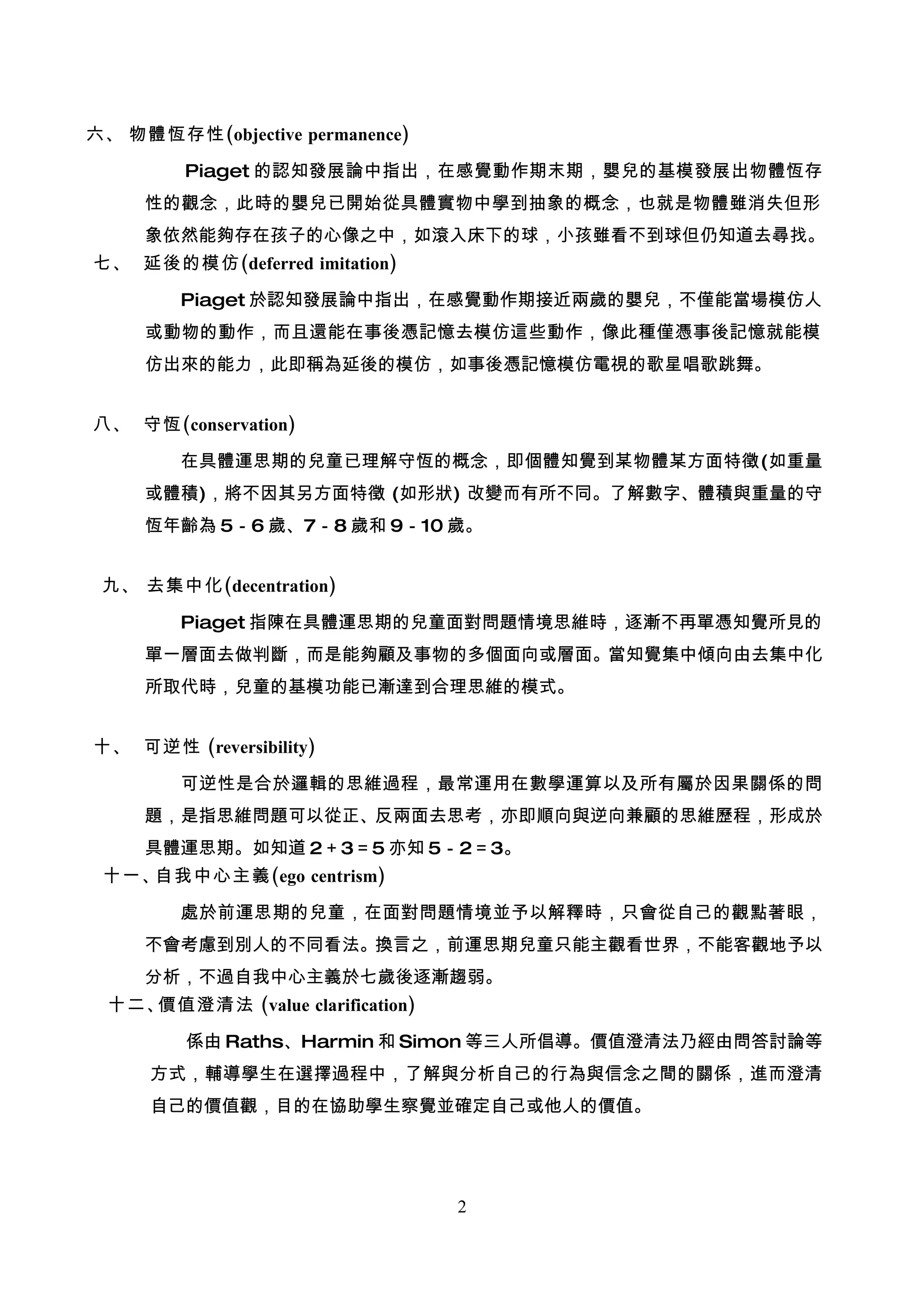 文档讨论了不同类型的评量方法,包括预备性评量、形成性评量、诊断性评量和总结性评量,旨在了解学生的学习情况与需求。此外,文章还探讨了儿童认知发展理论,如物体恆存性、延后模仿、守恆等概念,以及教学中的有效策略,如鷹架作用和配合加一原則,提供教师指导学生学习的理论基础。最后,文中强调了后设认知的重要性,旨在提升学生对自身学习过程的掌控与理解。