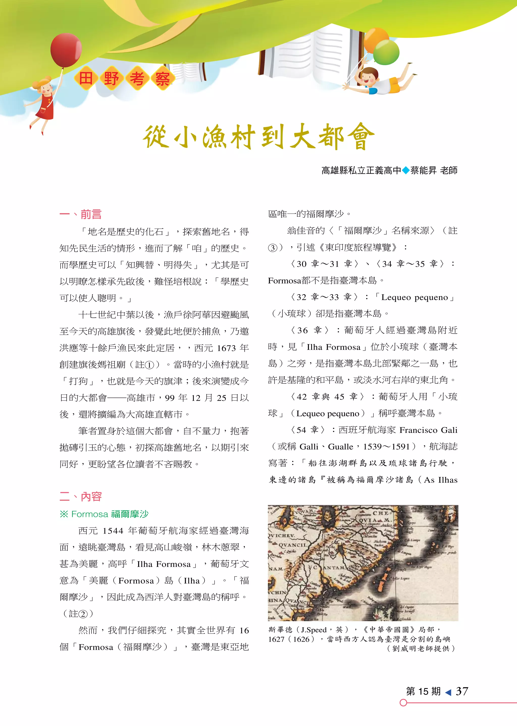 察 從小漁村到大都會 高雄縣私立正義高中◆蔡能昇 老師 一、前言 區唯一的福爾摩沙。 「地名是歷史的化石」,探索舊地名,得 翁佳音的〈「福爾摩沙」名稱來源〉(註 知先民生活的情形,進而了解「咱」的歷史。 3),引述《東印度旅程導覽》: 而學歷史可以「知興替、明得失」,尤其是可 〈30 章∼31 章〉、〈34 章∼35 章〉: 以明瞭怎樣承先啟後,難怪培根說:「學歷史 Formosa都不是指臺灣本島。 可以使人聰明。」 〈32 章∼33 章〉:「Lequeo pequeno」 十七世紀中葉以後,漁戶徐阿華因避颱風 (小琉球)卻是指臺灣本島。 至今天的高雄旗後,發覺此地便於捕魚,乃邀 〈36 章〉:葡萄牙人經過臺灣島附近 洪應等十餘戶漁民來此定居,,西元 1673 年 時,見「Ilha Formosa」位於小琉球(臺灣本 創建旗後媽祖廟(註1)。當時的小漁村就是 島)之旁,是指臺灣本島北部緊鄰之一島,也 「打狗」,也就是今天的旗津;後來演變成今 許是基隆的和平島,或淡水河右岸的東北角。 日的大都會──高雄市,99 年 12 月 25 日以 〈42 章與 45 章〉:葡萄牙人用「小琉 後,還將擴編為大高雄直轄市。 球」(Lequeo pequeno)」稱呼臺灣本島。 筆者置身於這個大都會,自不量力,抱著 〈54 章〉:西班牙航海家 Francisco Gali 拋磚引玉的心態,初探高雄舊地名,以期引來 (或稱 Galli、Gualle,1539∼1591),航海誌 同好,更盼望各位讀者不吝賜教。 寫著:「船往澎湖群島以及琉球諸島行駛, 東邊的諸島『被稱為福爾摩沙諸島(As Ilhas 二、內容 ※ Formosa 福爾摩沙 西元 1544 年葡萄牙航海家經過臺灣海 面,遠眺臺灣島,看見高山峻嶺,林木蔥翠, 甚為美麗,高呼「Ilha Formosa」,葡萄牙文 意為「美麗(Formosa)島(Ilha)」。「福 爾摩沙」,因此成為西洋人對臺灣島的稱呼。 (註2) 然而,我們仔細探究,其實全世界有 16 斯畢德(J.Speed,英),《中華帝國圖》局部, 1627(1626),當時西方人認為臺灣是分割的島嶼 個「Formosa(福爾摩沙)」,臺灣是東亞地 (劉威明老師提供) 第 15 期 e 37