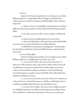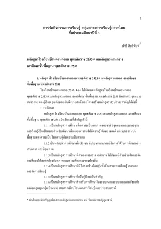 การจัดกิจกรรมการเรียนรู กลุมสาระการเรียนรูภาษาไทย ชั้นประถมศึกษาปที่ 1 * พัชรี สิ มสี พิมพ์ หลกสูตรโรงเรียนบ้ านดอนกลอย พุทธศักราช 2553 ตามหลักสู ตรแกนกลาง ั การศึกษาขั้นพืนฐาน พุทธศักราช 2551 ้ 1. หลักสู ตรโรงเรียนบ้ านดอนกลอย พุทธศักราช 2553 ตามหลักสู ตรแกนกลางการศึกษา ข้นพนฐาน พุทธศักราช 2551 ั ื้ ้ ้ ํ โรงเรียนบานดอนกลอย (2553: 4-6) ไดกาหนดหลกสูตรโรงเรี ยนบานดอนกลอย ั ้ พุทธศักราช 2553 ตามหลักสู ตรแกนกลางการศึกษาขั้นพื้นฐาน พุทธศักราช 2551 มีหลกการ จุดหมาย ั สมรรถนะของผูเ้ รี ยน คุณลกษณะอนพงประสงค์ และโครงสร้างหลักสูตร สรุ ปสาระสําคัญได้ดงนี้ ั ั ึ ั 1.1 หลกการ ั หลักสู ตรโรงเรี ยนบานดอนกลอย พุทธศักราช 2553 ตามหลักสูตรแกนกลางการศึกษา ้ ขั้นพื้นฐาน พุทธศักราช 2551 มีหลักการที่สาคัญ ดังนี้ ํ 1.1.1 เป็ นหลักสู ตรการศึกษาเพื่อความเป็ นเอกภาพของชาติ มีจุดหมายและมาตรฐาน การเรียนรู้เป็นเป้าหมายสําหรับพัฒนาเด็กและเยาวชนให้มีความรู ้ ทักษะ เจตคติ และคุณธรรมบน พื้นฐานของความเป็ นไทยควบคู่กบความเป็ นสากล ั 1.1.2 เป็ นหลักสูตรการศึกษาเพื่อปวงชน ที่ประชาชนทุกคนมีโอกาสได้รับการศึกษาอย่าง เสมอภาค และมีคุณภาพ 1.1.3 เป็นหลกสูตรการศึกษาที่สนองการกระจายอานาจ ให้สงคมมีส่วนร่ วมในการจัด ั ํ ั การศึกษาให้สอดคล้องกับสภาพและความต้องการของท้องถิ่น ื ุ่ ั ้ 1.1.4 เป็นหลกสูตรการศึกษาที่มีโครงสร้างยดหยนท้ งดานสาระการเรียนรู้ เวลาและ ั การจดการเรียนรู้ ั 1.1.5 เป็นหลกสูตรการศึกษาที่เนนผเู ้ รียนเป็นสาคญ ั ้ ํ ั 1.1.6 เป็นหลกสูตรการศึกษาสาหรับการศึกษาในระบบ นอกระบบ และตามอัธยาศัย ั ํ ครอบคลุมทุกกลุ่มเป้ าหมาย สามารถเทียบโอนผลการเรี ยนรู ้ และประสบการณ์ * นักศึกษาระดับปริ ญญาโท สาขาหลักสูตรและการสอน มหาวิทยาลยราชภัฏอุดรธานี ั