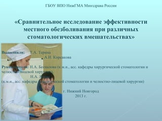 Документ представляет собой исследование эффективности местного обезболивания при стоматологических вмешательствах, выполненное в Нижегородской области. Исследование охватывает 50 пациентов, разделенных на группы в зависимости от типа вмешательства, с целью оценки различных методик анестезии. Выводы показывают, что эффективность анестезии варьируется в зависимости от анатомических особенностей верхней и нижней челюстей, а современные анестетики, такие как артикаин, демонстрируют высокую эффективность и малую токсичность.