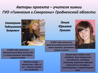 Документ описывает внеклассный проект «химический калейдоскоп», направленный на популяризацию химии среди учащихся гимназии. Проект включает конкурсные и исследовательские активности, активное использование информационных технологий и привлечение родителей и детей разных возрастов. Основная цель проекта — развитие интеллектуального потенциала и познавательных интересов в области химии через практические эксперименты и научные исследования.