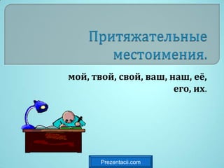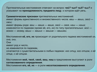 Документ описывает притяжательные местоимения в русском языке, их грамматические особенности, формы, и функции в предложении. Он включает примеры использования этих местоимений в контексте и поясняет, как они отвечают на вопросы о принадлежности. Также рассматривается взаимодействие притяжательных местоимений с другими частями речи.