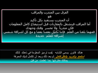 يتناول الوثيقة تدريب المتعلمين على التعامل مع المعلومات والتطبيقات بشكل فعّال، ويؤكد على أهمية اكتساب المعرفة والمهارات من خلال المقارنات والتنفيذ العملي. كما يشدد على ضرورة تقييم الاحتياجات والتأكد من توافق التدريب مع أهداف المتدربين ومتطلباتهم، برؤية شاملة لدورة التدريب. يعتمد النهج التعليمي المقدم على التفاعل والمشاركة بين المدرب والمتدربين لضمان استمرارية التعلم وتطبيق المهارات المكتسبة.