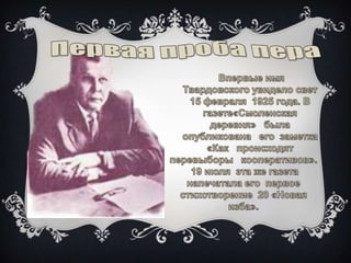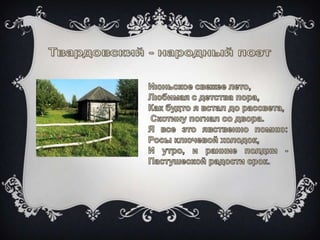 Документ посвящен родине великого русского поэта А. Т. Твардовского и описывает его воспоминания о жизни на хуторе Загорье. Основная тема текста — историческая память, особенно о погибших на войне, что является важным мотивом в лирике поэта. В нём также звучит отражение душевной боли и трагизма, связанных с утратами на войне.