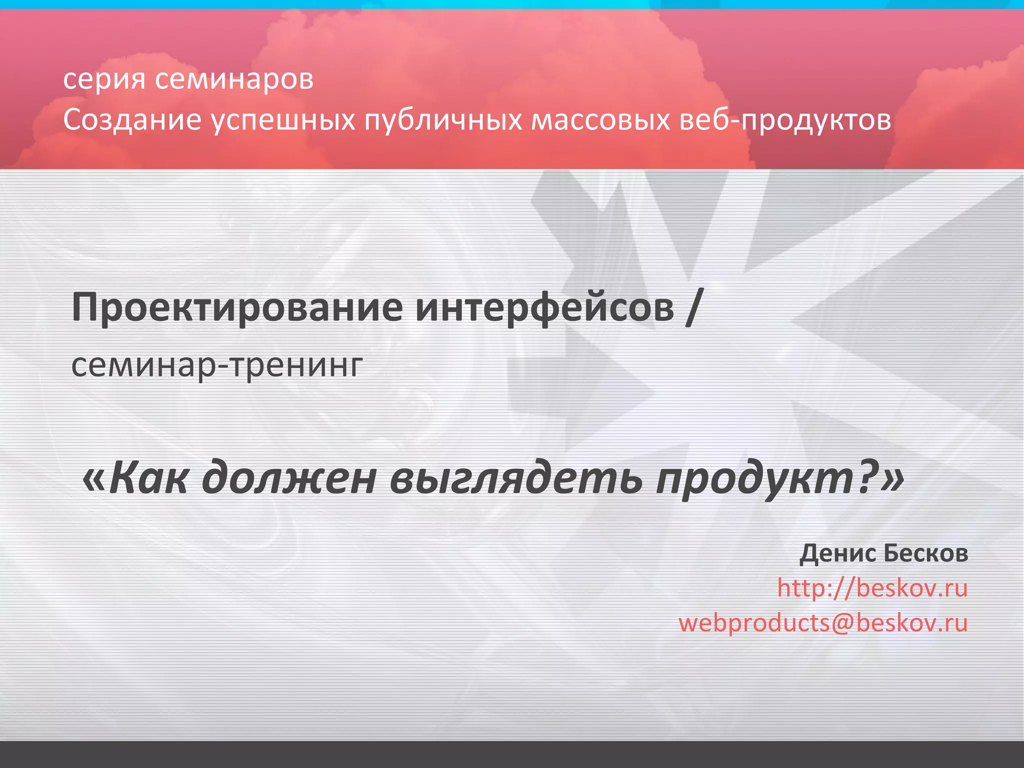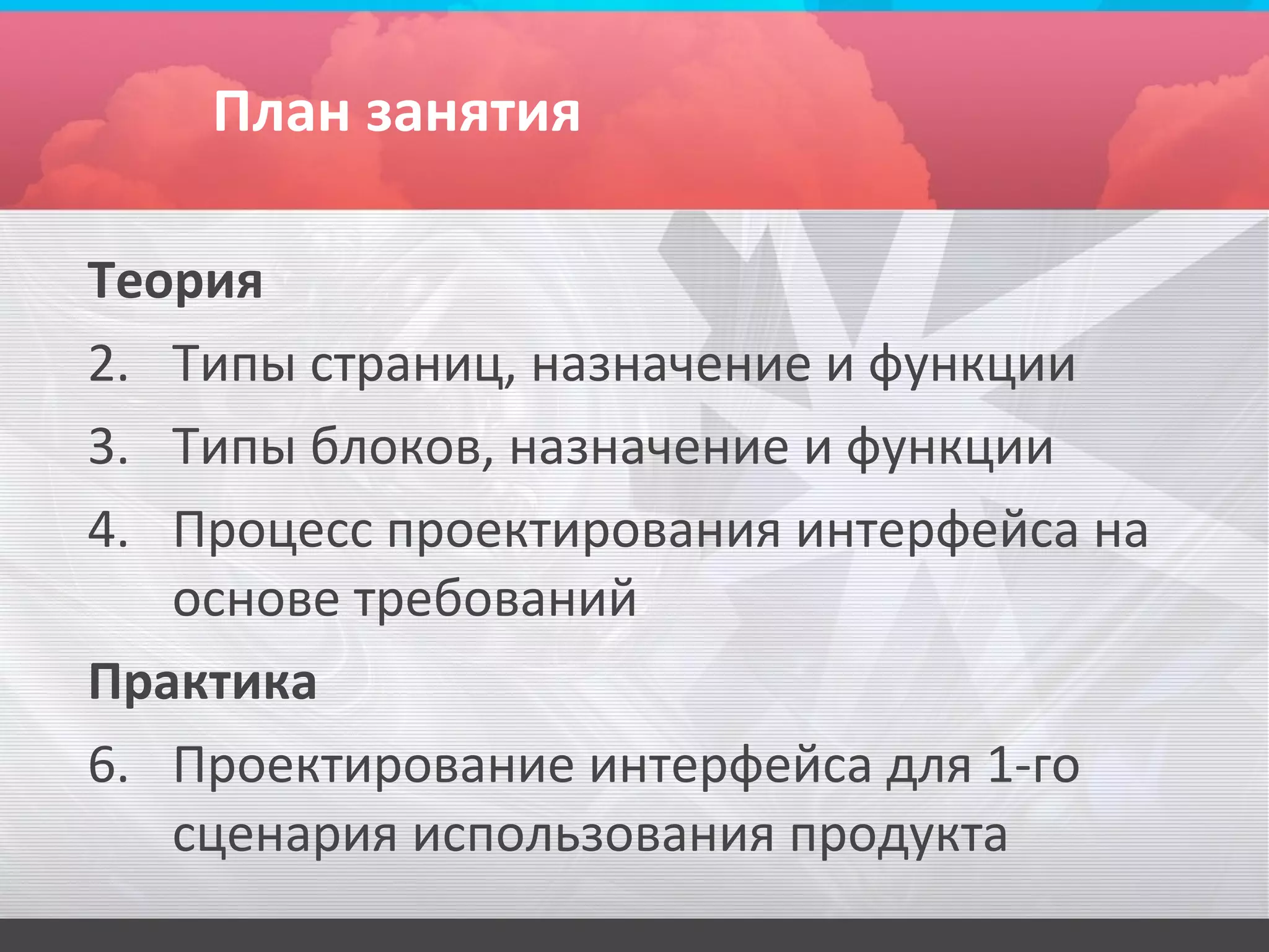 Документ представляет собой план семинара по проектированию интерфейсов для веб-продуктов, где рассматриваются типы страниц и блоков, их назначение и функции. Обсуждаются процессы проектирования интерфейса, включая анализ сценариев, размещение блоков и создание модели навигации. Приводятся примеры проектирования интерфейса на основе сценария, связанного с бронированием билетов.