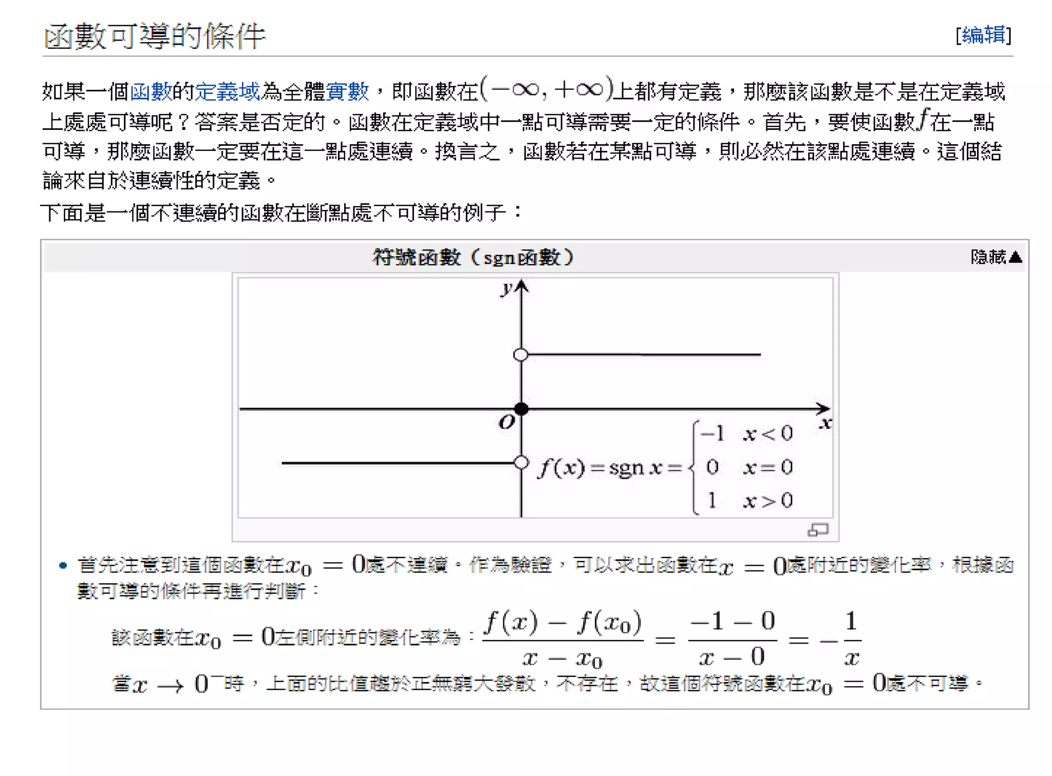 定義:(可微分)若 f(x) 在 x=c 點可微分,則 f 必須滿足下列條件。