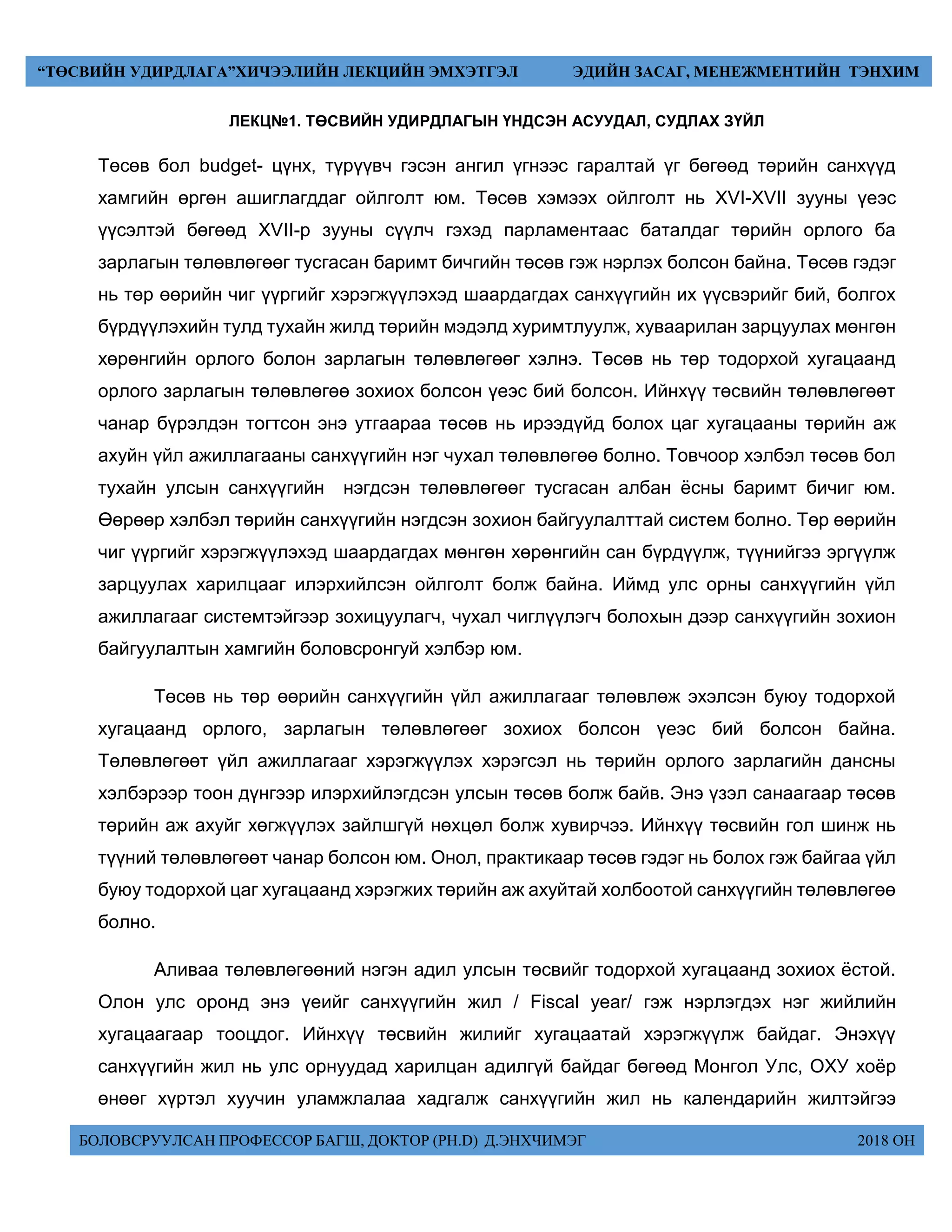 ДОКТОР (PH.D) Д.ЭНХЧИМЭГ 2018 ОН “ТӨСВИЙН УДИРДЛАГА”ХИЧЭЭЛИЙН ЛЕКЦИЙН ЭМХЭТГЭЛ ЭДИЙН ЗАСАГ, МЕНЕЖМЕНТИЙН ТЭНХИМ