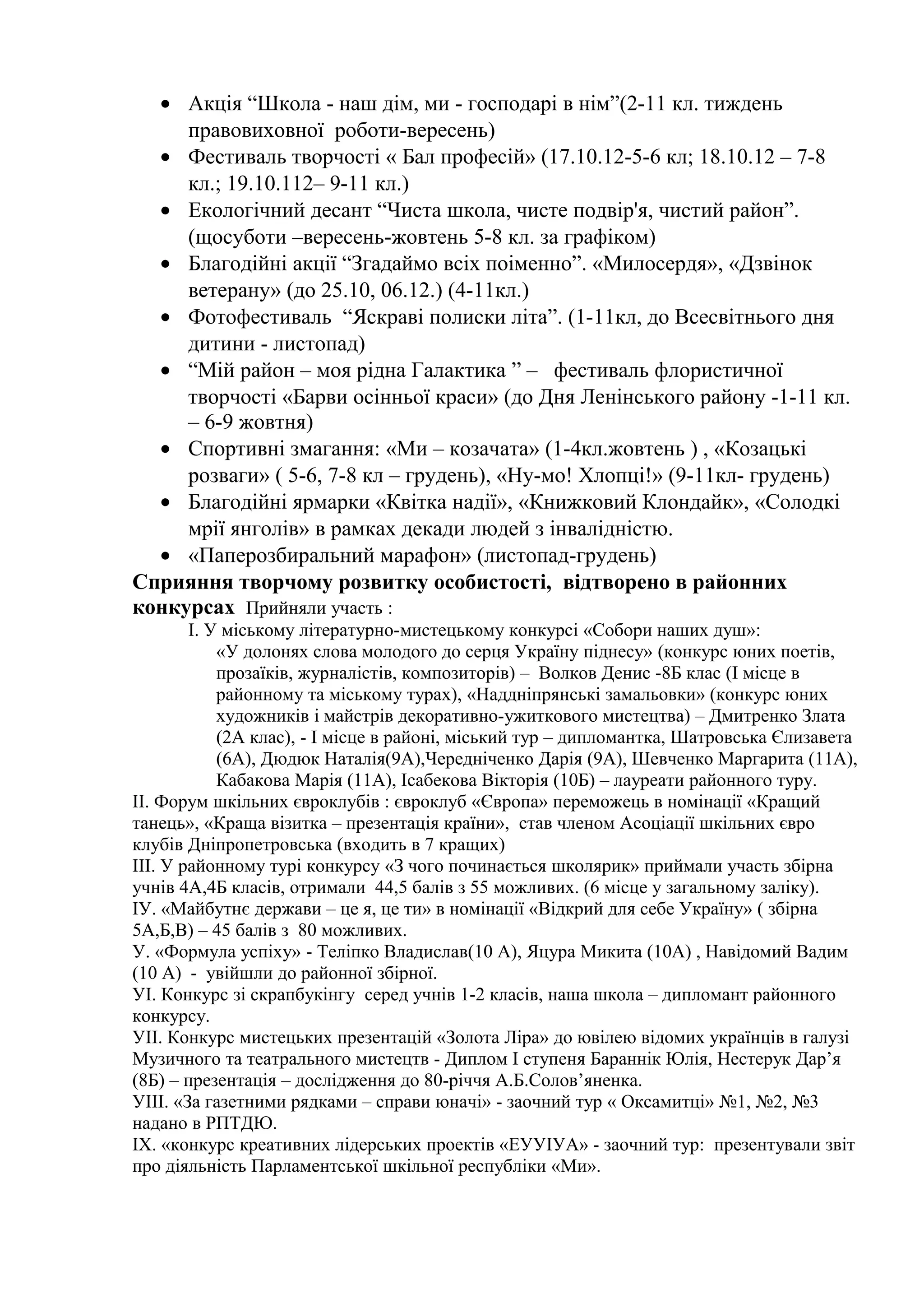 • Фестиваль творчості « Бал професій» (17.10.12-5-6 кл; 18.10.12 – 7-8