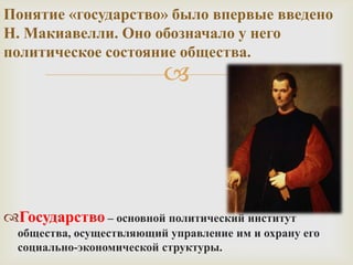 Документ охватывает понятие и функции государства, впервые описанные Н. Макиавелли, а также различные теории его происхождения, включая патриархальную, теологическую и социально-экономическую. Он рассматривает формы правления (монархия, республика) и государственное устройство (федерация, конфедерация, унитарное государство), освещая различия между ними. Документ также упоминает примеры различных стран и их политических систем.
