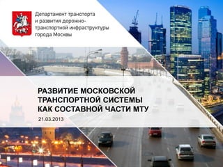 Документ описывает развитие транспортной системы Москвы, включая инфраструктурные программы и операционные улучшения, направленные на решение транспортных проблем города. Основные цели программы включают улучшение доступа к метро, развитие пригородного железнодорожного сообщения и создание комфортного общественного транспорта. Ожидается, что для достижения этих целей потребуется более 400 млрд. рублей частных инвестиций.