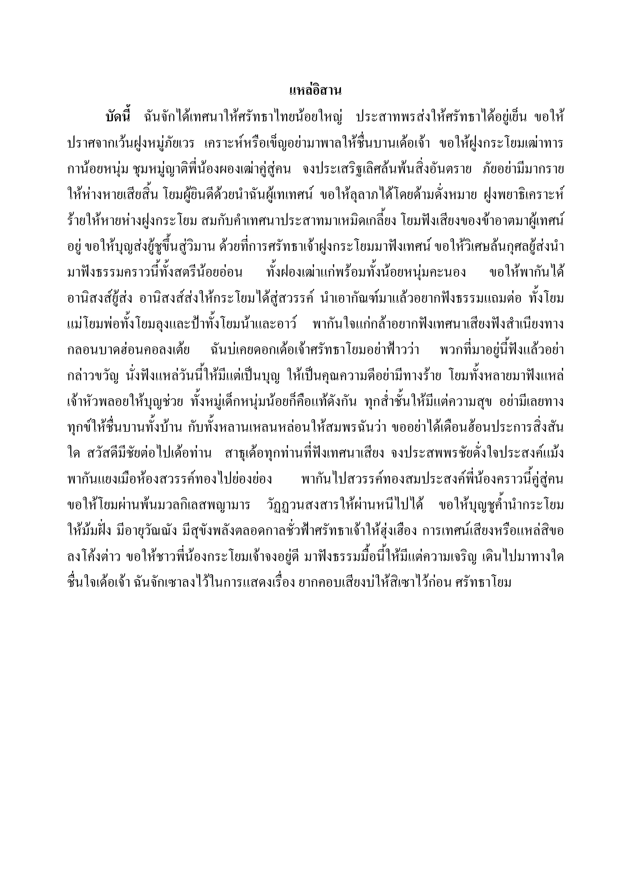 ิ บัดนี้ ฉันจักไดเทศนาใหศรัทธาไทยนอยใหญ ประสาทพรสงใหศรัทธาไดอยูเย็น ขอให ปราศจากเวนฝูงหมูภัยเวร เคราะหหรือเข็ญอยามาพาลใหชื่นบานเดอเจา ขอใหฝูงกระโยมเฒาทาร กานอยหนุม ชุมหมูญาติพี่นองผองเฒาคูสูคน จงประเสริฐเลิศลนพนสิ่งอันตราย ภัยอยามีมากราย ใหหางหายเสียสิ้น โยมผูยินดีดวยนําฉันผูเทเทศน ขอใหลุลาภไดโดยดามดั่งหมาย ฝูงพยาธิเคราะห รายใหหายหางฝูงกระโยม สมกับคําเทศนาประสาทมาเหมิดเกลี้ยง โยมฟงเสียงของขาอาตมาผูเทศน อยู ขอใหบุญสงยูชูขึ้นสูวิมาน ดวยทีการศรัทธาเจาฝูงกระโยมมาฟงเทศน ขอใหวิเศษลนกุศลยูสงนํา ่ มาฟงธรรมคราวนี้ทั้งสตรีนอยออน ทั้งฝองเฒาแกพรอมทั้งนอยหนุมคะนอง ขอใหพากันได อานิสงสยูสง อานิสงสสงใหกระโยมไดสูสวรรค นําเอากัณฑมาแลวอยากฟงธรรมแถมตอ ทั้งโยม แมโยมพอทังโยมลุงและปาทั้งโยมนาและอาว พากันใจแกกลาอยากฟงเทศนาเสียงฟงสําเนียงทาง ้ กลอนบาดฮอนคอลงเตย ฉันบเคยดอกเดอเจาศรัทธาโยมอยาฟาววา พวกที่มาอยูนี้ฟงแลวอยา กลาวขวัญ นังฟงแหลวันนี้ใหมีแตเปนบุญ ใหเปนคุณความดีอยามีทางราย โยมทั้งหลายมาฟงแหล ่ เจาหัวพลอยใหบุญชวย ทั้งหมูเด็กหนุมนอยก็คอแทดังกัน ทุกส่ําชั้นใหมีแตความสุข อยามีเลยทาง ื ทุกขใหชื่นบานทั้งบาน กับทั้งหลานเหลนหลอนใหสมพรฉันวา ขออยาไดเดือนฮอนประการสิ่งสัน ใด สวัสดีมีชัยตอไปเดอทาน สาธุเดอทุกทานที่ฟงเทศนาเสียง จงประสพพรชัยดั่งใจประสงคแมง พากันแยงเมือหองสวรรคทองไปยองยอง พากันไปสวรรคทองสมประสงคพนองคราวนี้คูสูคนี่ ขอใหโยมผานพนมวลกิเลสพญามาร วัฏฏวนสงสารใหผานหนีไปได ขอใหบุญชูค้ํานํากระโยม ใหมมฝง มีอายุวัณณัง มีสุขังพลังตลอดกาลชั่วฟาศรัทธาเจาใหฮุงเฮือง การเทศนเสียงหรือแหลสิขอ ลงโคงตาว ขอใหชาวพีนองกระโยมเจาจงอยูดี มาฟงธรรมมื้อนี้ใหมีแตความเจริญ เดินไปมาทางใด ่ ชื่นใจเดอเจา ฉันจักเซาลงไวในการแสดงเรื่อง ยากคอบเสียงบใหสิเซาไวกอน ศรัทธาโยม