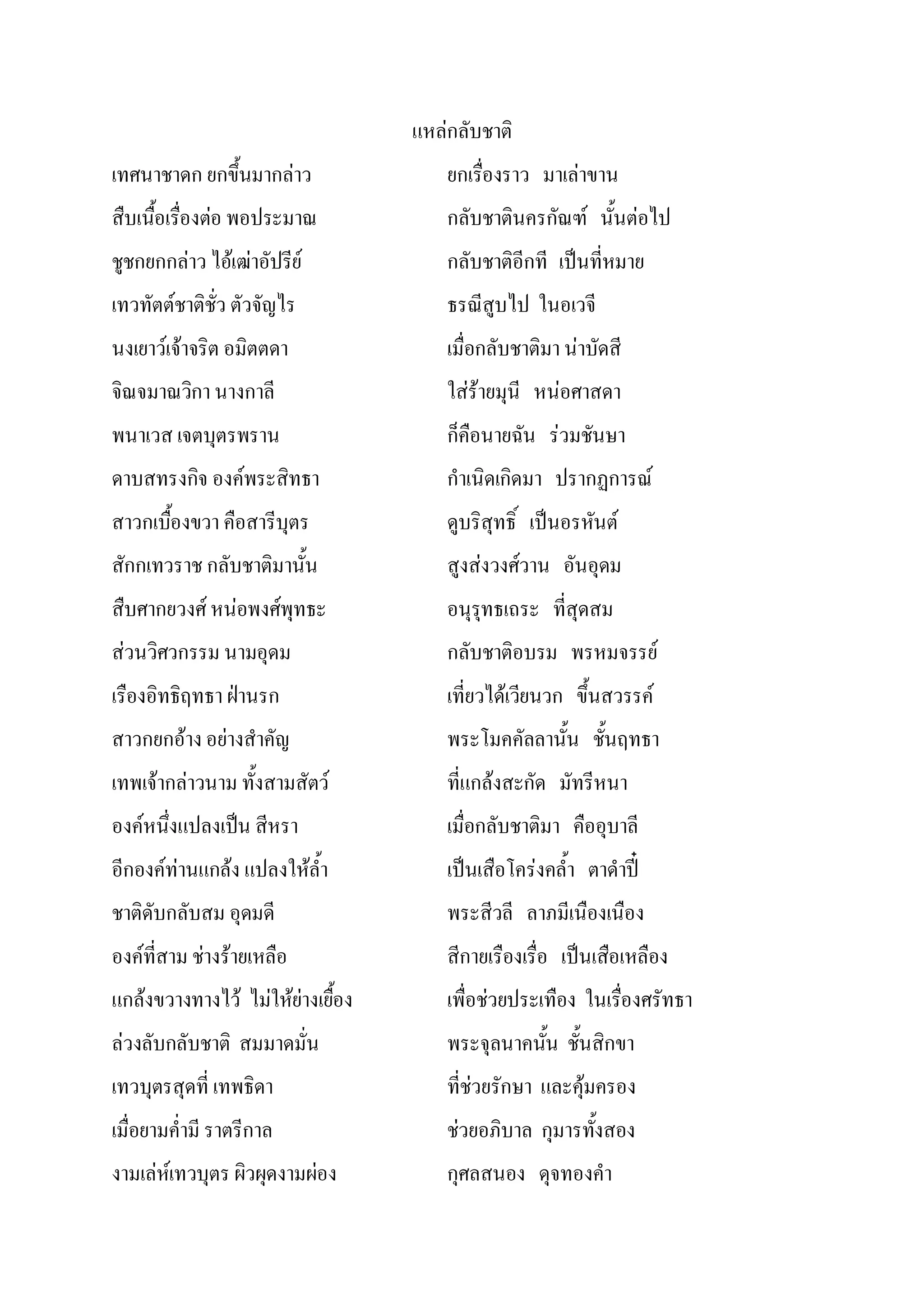 มาเลาขาน สืบเนื้อเรื่องตอ พอประมาณ กลับชาตินครกัณฑ นั้นตอไป ชูชกยกกลาว ไอเฒาอัปรีย กลับชาติอีกที เปนที่หมาย เทวทัตตชาติชั่ว ตัวจัญไร ธรณีสูบไป ในอเวจี นงเยาวเจาจริต อมิตตดา เมื่อกลับชาติมา นาบัดสี จิณจมาณวิกา นางกาลี ใสรายมุนี หนอศาสดา พนาเวส เจตบุตรพราน ก็คือนายฉัน รวมชันษา ดาบสทรงกิจ องคพระสิทธา กําเนิดเกิดมา ปรากฏการณ สาวกเบื้องขวา คือสารีบุตร ดูบริสุทธิ์ เปนอรหันต สักกเทวราช กลับชาติมานั้น สูงสงวงศวาน อันอุดม สืบศากยวงศ หนอพงศพุทธะ อนุรุทธเถระ ที่สุดสม สวนวิศวกรรม นามอุดม กลับชาติอบรม พรหมจรรย เรืองอิทธิฤทธา ฝานรก เที่ยวไดเวียนวก ขึ้นสวรรค สาวกยกอาง อยางสําคัญ พระโมคคัลลานั้น ชั้นฤทธา เทพเจากลาวนาม ทั้งสามสัตว ที่แกลงสะกัด มัทรีหนา องคหนึ่งแปลงเปน สีหรา เมื่อกลับชาติมา คืออุบาลี อีกองคทานแกลง แปลงใหล้ํา เปนเสือโครงคล้ํา ตาดําป ชาติดับกลับสม อุดมดี พระสีวลี ลาภมีเนืองเนือง องคที่สาม ชางรายเหลือ สีกายเรืองเรื่อ เปนเสือเหลือง แกลงขวางทางไว ไมใหยางเยื้อง เพื่อชวยประเทือง ในเรื่องศรัทธา ลวงลับกลับชาติ สมมาดมั่น พระจุลนาคนั้น ชั้นสิกขา เทวบุตรสุดที่ เทพธิดา ที่ชวยรักษา และคุมครอง เมื่อยามค่ํามี ราตรีกาล ชวยอภิบาล กุมารทั้งสอง งามเลหเทวบุตร ผิวผุดงามผอง กุศลสนอง ดุจทองคํา
