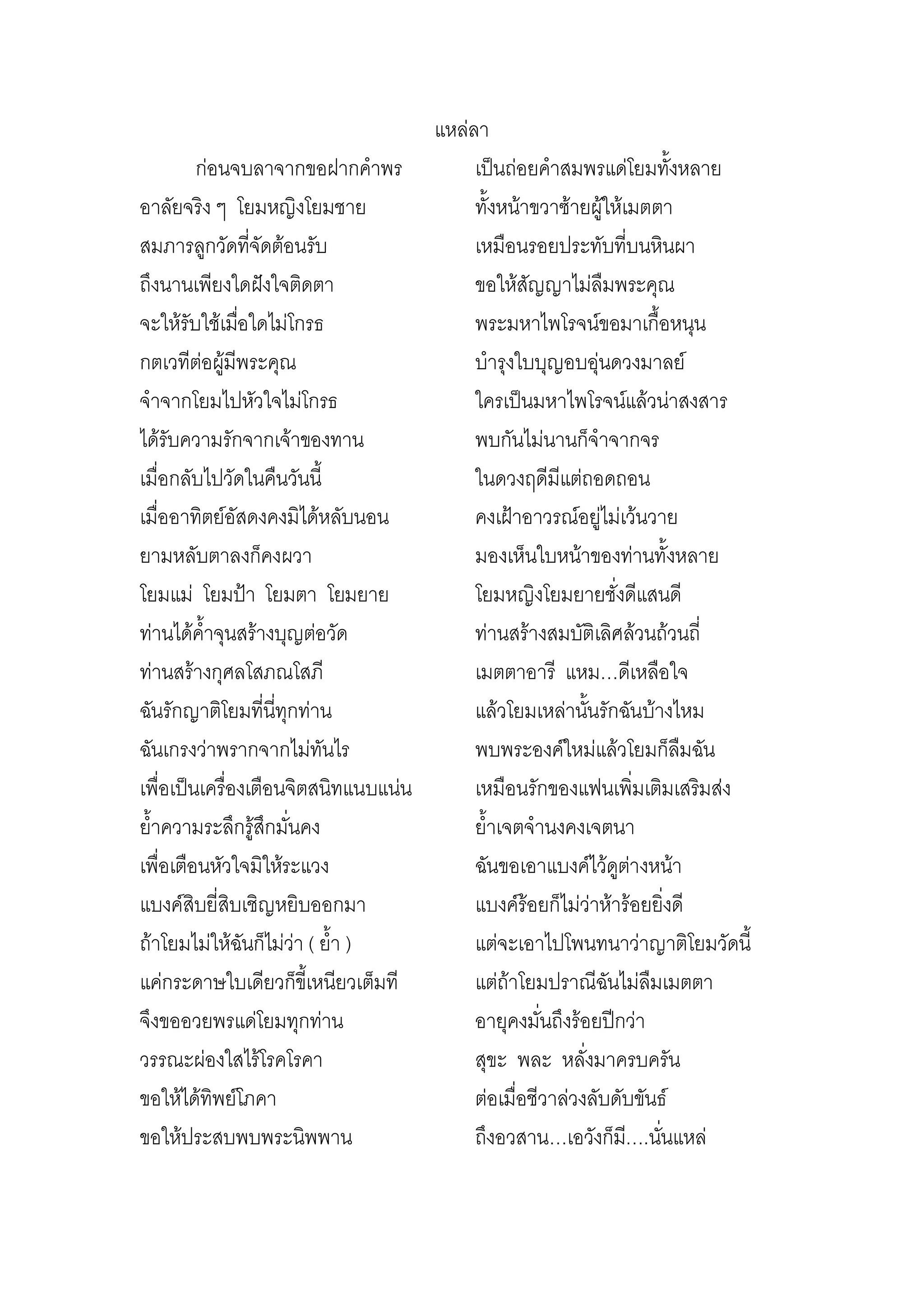 กอนจบลาจากขอฝากคําพร เปนถอยคําสมพรแดโยมทั้งหลาย อาลัยจริง ๆ โยมหญิงโยมชาย ทั้งหนาขวาซายผูใหเมตตา สมภารลูกวัดที่จัดตอนรับ เหมือนรอยประทับที่บนหินผา ถึงนานเพียงใดฝงใจติดตา ขอใหสัญญาไมลืมพระคุณ จะใหรับใชเมือใดไมโกรธ ่ พระมหาไพโรจนขอมาเกื้อหนุน กตเวทีตอผูมีพระคุณ บํารุงใบบุญอบอุนดวงมาลย จําจากโยมไปหัวใจไมโกรธ ใครเปนมหาไพโรจนแลวนาสงสาร ไดรับความรักจากเจาของทาน พบกันไมนานก็จําจากจร เมื่อกลับไปวัดในคืนวันนี้ ในดวงฤดีมีแตถอดถอน เมืออาทิตยอัสดงคงมิไดหลับนอน ่ คงเฝาอาวรณอยูไมเวนวาย ยามหลับตาลงก็คงผวา มองเห็นใบหนาของทานทั้งหลาย โยมแม โยมปา โยมตา โยมยาย โยมหญิงโยมยายชั่งดีแสนดี ทานไดค้ําจุนสรางบุญตอวัด ทานสรางสมบัติเลิศลวนถวนถี่ ทานสรางกุศลโสภณโสภี เมตตาอารี แหม…ดีเหลือใจ ฉันรักญาติโยมที่นี่ทุกทาน แลวโยมเหลานั้นรักฉันบางไหม ฉันเกรงวาพรากจากไมทันไร พบพระองคใหมแลวโยมก็ลืมฉัน เพื่อเปนเครื่องเตือนจิตสนิทแนบแนน เหมือนรักของแฟนเพิ่มเติมเสริมสง ย้ําความระลึกรูสึกมั่นคง ย้ําเจตจํานงคงเจตนา เพื่อเตือนหัวใจมิใหระแวง ฉันขอเอาแบงคไวดูตางหนา แบงคสิบยี่สิบเชิญหยิบออกมา แบงครอยก็ไมวาหารอยยิ่งดี ถาโยมไมใหฉันก็ไมวา ( ย้ํา ) แตจะเอาไปโพนทนาวาญาติโยมวัดนี้ แคกระดาษใบเดียวก็ขี้เหนียวเต็มที แตถาโยมปราณีฉันไมลืมเมตตา จึงขออวยพรแดโยมทุกทาน อายุคงมั่นถึงรอยปกวา วรรณะผองใสไรโรคโรคา สุขะ พละ หลั่งมาครบครัน ขอใหไดทิพยโภคา ตอเมื่อชีวาลวงลับดับขันธ ขอใหประสบพบพระนิพพาน ถึงอวสาน…เอวังก็ม….นั่นแหล ี
